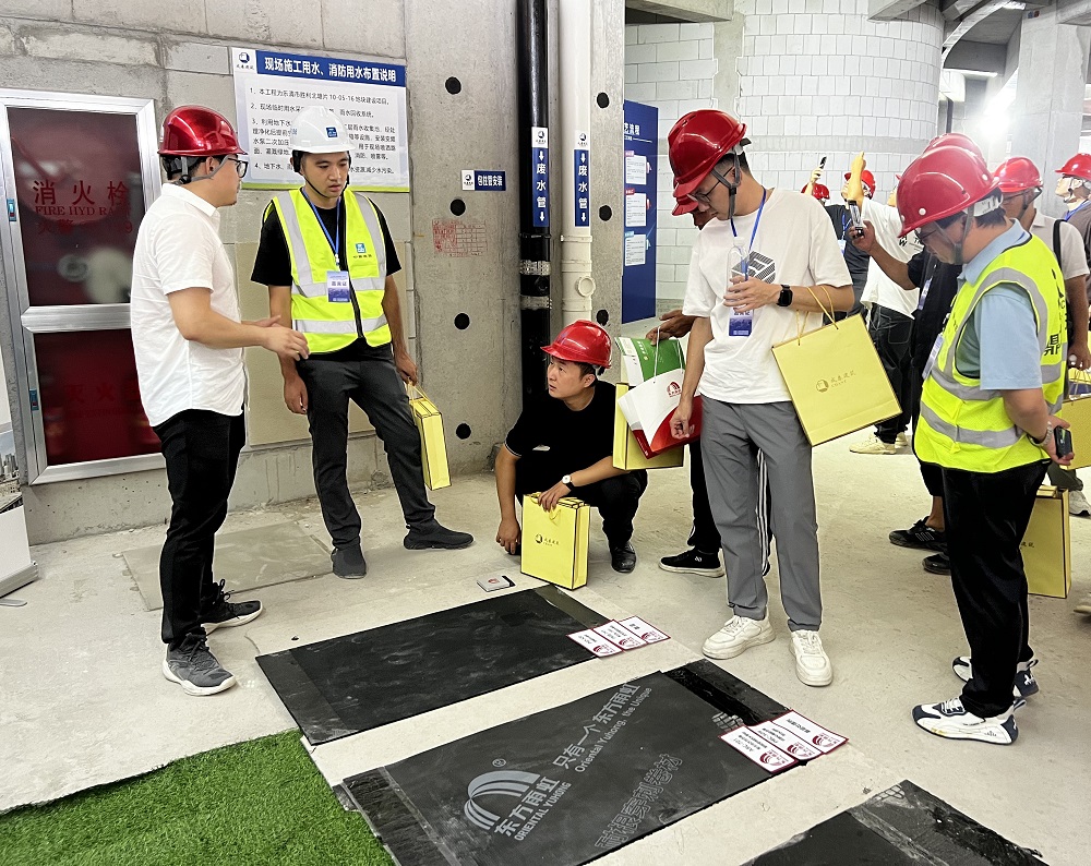 活動現(xiàn)場,東方雨虹技術(shù)人員詳細講解金屬屋面TPO等產(chǎn)品的性能優(yōu)勢、環(huán)保特性及應(yīng)用場景,并將材料選擇、安全規(guī)范、施工工法等影響工程效果關(guān)鍵因素融于底板、側(cè)墻、頂板防水施工打樣展示。此外,通過操作智能卷材攤鋪機、聚氨酯噴涂機等設(shè)備,全方位呈現(xiàn)其功能與特性,讓現(xiàn)場觀眾近距離感受產(chǎn)品的獨特性。