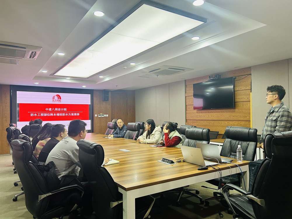 日前,中建八局(山東)設(shè)計咨詢有限公司(以下簡稱“中建八局設(shè)計院”)與東方雨虹舉辦建筑工程防水技術(shù)交流會。此次交流會旨在推動雙方在建筑防水技術(shù)領(lǐng)域合作,共助行業(yè)標準和規(guī)范的實施。中建八局設(shè)計院總設(shè)計工程師王同春主持會議,東方雨虹山東公司技術(shù)總工宿健受邀分享。